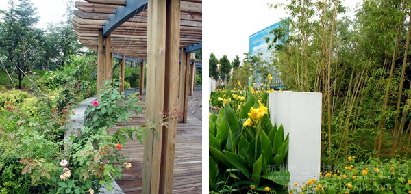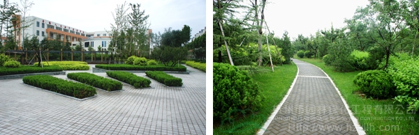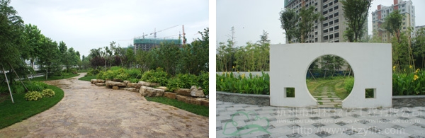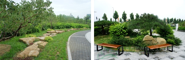 每個(gè)景觀節(jié)點(diǎn)上,植物的配置方法都是不一樣的,如在下沉廣場(chǎng),主要是以小龍柏、金葉女貞等小灌木片植成方形或弧形,間或點(diǎn)綴石楠、梅樹,看起來規(guī)整、簡(jiǎn)潔;而在設(shè)計(jì)風(fēng)格為江南園林的南廣場(chǎng)上,是將貴重的造型油松單植,通過不同的組合,形成三個(gè)風(fēng)格相近的綠島,周邊種植美人蕉、玉簪、竹子,并砌起白墻,上面開圓形拱門或圓窗,散發(fā)出詩(shī)意江南的靜謐和婉約氣息。“游憩步道是貫穿整個(gè)景觀的軸線,為了形成曲徑通幽的景觀效果,我們將對(duì)植、孤植、叢植都多種方法結(jié)合運(yùn)用,特別是在三叉路口,多種植海棠、櫻花、杏花等,一方面,花開的時(shí)候,綠葉間繁花點(diǎn)點(diǎn),會(huì)吸引人們不斷向前探尋更多的美景;而花落之后,茂密的枝葉又形成隱隱約約的視覺感受,前方轉(zhuǎn)過彎后風(fēng)景什么樣,又讓人很想去看看。”高經(jīng)理笑著說。