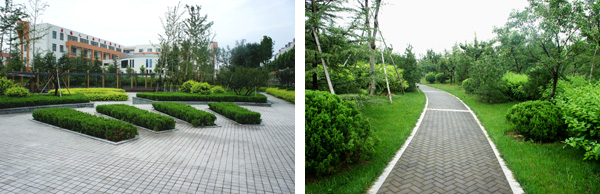 而在道路十字路口的節(jié)點(diǎn)處,則主要是用10cm×10cm的小花崗巖鋪地,鋪出來的路面整潔、平坦,看似簡單,實(shí)則對施工技術(shù)要求相當(dāng)高。草坪中的地面鋪裝,則采用花崗巖汀步,用錯縫鋪裝法,兩塊花崗巖之間用草皮鑲嵌,就像給每塊花崗巖鑲了一道綠邊,與旁邊的草坪和諧地融為一體。貫穿整個工程的游憩步道,全部采用"人字形"的鋪裝方法,中間用透水磚、兩邊以花崗巖鑲邊,透水磚價格不高,用以鑲邊的花崗巖是利用了鋪裝中剩余的邊料,雖然用料簡單,但通過對技術(shù)的嚴(yán)格要求,鋪出的路面卻整潔而不失韻味,是一種實(shí)用、環(huán)保、節(jié)約的做法。