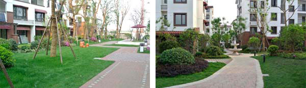 楊經(jīng)理說(shuō):“紫荊東郡的植物配置以統(tǒng)一中富于變化為原則,上層苗木主要選擇大規(guī)格的香樟、無(wú)患子和馬褂木等,中下層則以桂花、雞爪槭、紅葉石楠球、金森女貞球等常見的球類灌木及地被苗進(jìn)行組團(tuán),苗木的種類雖然不是很豐富,但在配置上卻形式多樣,特別是通過(guò)在施工時(shí)對(duì)設(shè)計(jì)的再深化,要求在植物種植時(shí),樹形、色彩、線條、質(zhì)地及比例都要有一定的差異和變化,顯示多樣性,但相互之間又有一定的相似性,從而使得整體的植物配置在和諧統(tǒng)一中顯得生動(dòng)活潑,簡(jiǎn)單而不單調(diào),統(tǒng)一而不呆板,營(yíng)造出一種寧?kù)o、閑適的氛圍。”