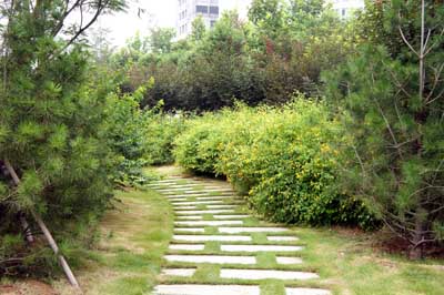 每個景觀節(jié)點上,植物的配置方法都是不一樣的,如在下沉廣場,主要是以小龍柏、金葉女貞等小灌木片植成方形或弧形,間或點綴石楠、梅樹,看起來規(guī)整、簡潔;而在設(shè)計風(fēng)格為江南園林的南廣場上,是將貴重的造型油松單植,通過不同的組合,形成三個風(fēng)格相近的綠島,周邊種植美人蕉、玉簪、竹子,并砌起白墻,上面開圓形拱門或圓窗,散發(fā)出詩意江南的靜謐和婉約氣息。“游憩步道是貫穿整個景觀的軸線,為了形成曲徑通幽的景觀效果,我們將對植、孤植、叢植都多種方法結(jié)合運用,特別是在三叉路口,多種植海棠、櫻花、杏花等,一方面,花開的時候,綠葉間繁花點點,會吸引人們不斷向前探尋更多的美景;而花落之后,茂密的枝葉又形成隱隱約約的視覺感受,前方轉(zhuǎn)過彎后風(fēng)景什么樣,又讓人很想去看看。”高經(jīng)理笑著說。