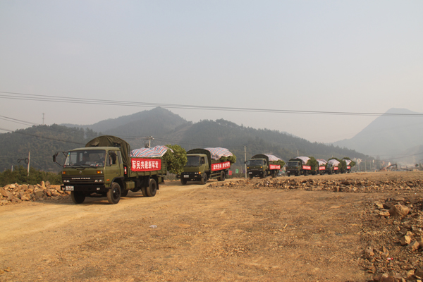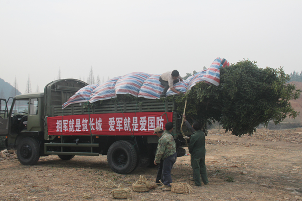 下午3點(diǎn)50分,八輛一字排開(kāi)的軍車全部裝上了苗木,并進(jìn)行了仔細(xì)的遮蓋和捆綁。隨后,在噼噼叭叭的鞭炮歡送聲中,車輛徐徐開(kāi)出基地,向舟山方向駛?cè)ァ?/p>