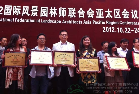 2012年度中國風(fēng)景園林學(xué)會“優(yōu)秀園林工程獎”共頒出獲獎項目195項,其中,“優(yōu)秀園林綠化工程獎”185項,“優(yōu)秀園林古建工程獎”10項。杭州市園林綠化工程有限公司承建的中國鐵建?國際城(杭州)示范區(qū)園林綠化工程和深圳市國道205深圳段改建工程景觀綠化工程G5402標段雙雙榮獲金獎。
