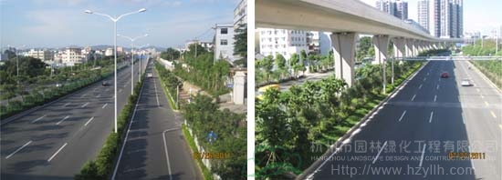 國道205深圳段改建工程景觀綠化工程G5402標段,是深圳市龍崗區(qū)迎大運重點景觀工程,位于國道205深圳段龍崗區(qū)地鐵三號線愛聯(lián)地鐵站至坪地與惠州市交界處,總綠化面積210000㎡。“以人為本,尊重自然”、“ 處處有綠葉、無處不飛花”等設(shè)計理念貫穿于工程始終,整條中央綠化帶位于高架橋下,長勢茂盛的各類植物形成一條色彩繽紛的彩帶擁簇著高架橋段,使整條橋段與綠化景觀有機融合。整條道路的景觀,不僅體顯出一個濱海大都市獨有的景觀特色,更彰顯出這個城市的生機活力與熱情奔放。