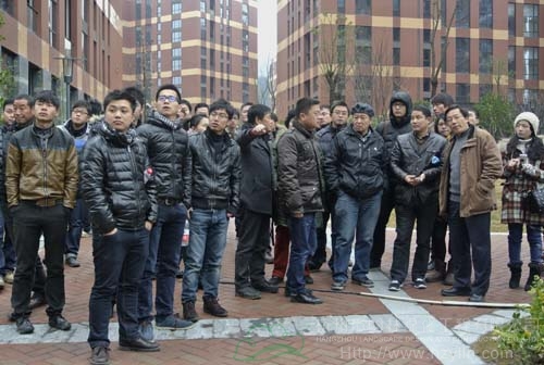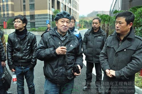 每到一個工程現(xiàn)場,工地負責人都先介紹工程的施工情況,然后,帶領大家進行參觀,并隨時解答觀摩組一行提出的各種問題。每項工程觀摩結(jié)束的時候,三位專家都會集中點評,從苗木種植、植物搭配、水景營造、地形整理等各方面指出工程施工中存在的優(yōu)勢與不足,并提出需要改進的地方。