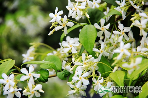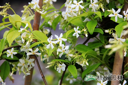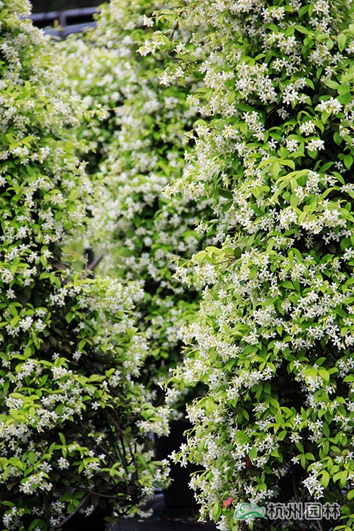意大利白花絡(luò)石藤(Rhyncospermum jasminoides),俗稱風(fēng)車茉莉,為夾竹桃科的常綠藤本,莖赤褐色,幼枝被黃色柔毛長(zhǎng),有氣生根。常攀緣在樹木、巖石墻垣上生長(zhǎng),是一流的藤蔓植物,四季常綠。開花期在夏季,5月進(jìn)入盛花期,開花量極大,有茉莉的香味,聞起來沁人心脾。