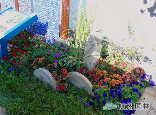 考慮到銀川的干燥氣候,垂直綠化墻植物的保濕成為難題。“浙江園”垂直綠化墻以無紡布為墻體材料,使用保濕性強的基質(zhì),優(yōu)選植物種類,同時搭配滴灌系統(tǒng),保證了綠化墻鮮花擁簇的景象。展園內(nèi)的垂直綠化墻設(shè)計簡潔、曲線優(yōu)美,與以錢塘江文化為主題的背景墻相互映襯,共同展現(xiàn)了新時期浙江園林景觀的不斷發(fā)展與創(chuàng)新。