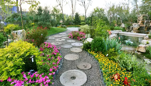 考慮到銀川的干燥氣候,垂直綠化墻植物的保濕成為難題。“浙江園”垂直綠化墻以無(wú)紡布為墻體材料,使用保濕性強(qiáng)的基質(zhì),優(yōu)選植物種類,同時(shí)搭配滴灌系統(tǒng),保證了綠化墻鮮花擁簇的景象。展園內(nèi)的垂直綠化墻設(shè)計(jì)簡(jiǎn)潔、曲線優(yōu)美,與以錢塘江文化為主題的背景墻相互映襯,共同展現(xiàn)了新時(shí)期浙江園林景觀的不斷發(fā)展與創(chuàng)新。