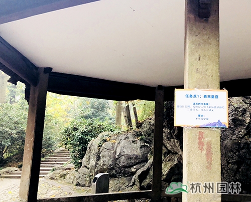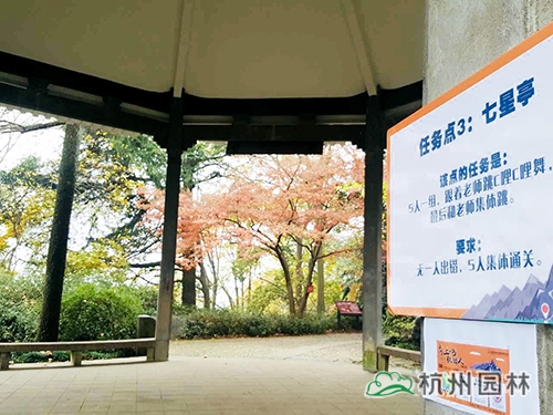 本次活動(dòng)的終點(diǎn)為玉皇山頂?shù)摹敖挥[閣”。玉皇山是杭州絕佳的觀秋景高地,站在山頂,可俯瞰杭州全城,八卦田的神秘、西湖的絢麗等盡收眼底;山上則是古樹參天,紅葉似火,黃葉賽金,彩林岑巒疊峰,如入畫里。大家從玉皇山北門上山,途經(jīng)林海亭、老玉皇宮、櫻花地、紫來(lái)洞天、七星亭,最后到達(dá)山頂?shù)摹敖挥[閣”。此次登山途中設(shè)立了3個(gè)任務(wù)點(diǎn),參加活動(dòng)人員需要完成相應(yīng)任務(wù),才能蓋章通關(guān)。