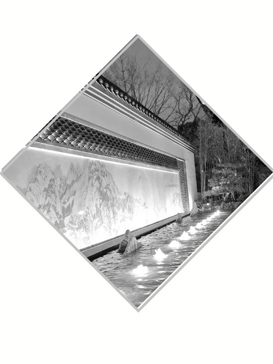 園區(qū)主入口,游人一進園,就能看到大瀑布和亭子,再加上富春山居圖造壁,呈現(xiàn)出浙江山水風景特點。浙江省地形復雜,其中三分之二的面積是山地丘陵,所以,浙江園也是依此而建的。為了能讓往來的游客在進園時就直觀的感受到這種景觀效果,盧山和團隊為游客們設計了兩條游覽線,一條從入口進來之后向山上走,體驗登高望遠,感受山林景觀的游覽過程;還有一條是從庭院路線走的,就是讓游客有行走在家宅的感覺。在設計時,盧山選取了明清時期的建筑形態(tài),粉墻黛瓦。建筑上層是黑的,墻是白的,展現(xiàn)出浙江傳統(tǒng)建筑的文化元素。盧山還說:“眾所周知,浙江的茶葉非常有名,我們在展園里打造成了一個茶山景觀,再配上一些花卉。總體上,是要展示出一個富美浙江主題的庭院。”