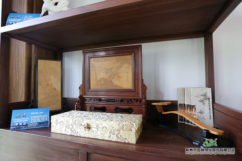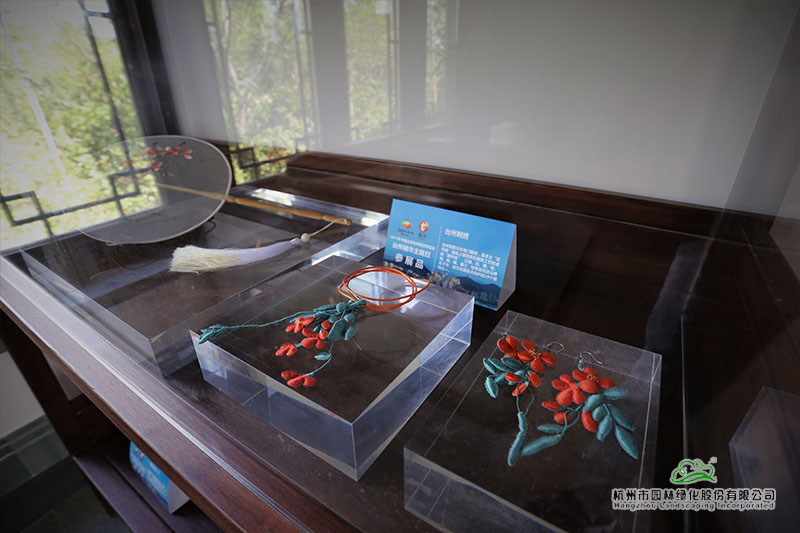 在以浙派民居為風格的主題建筑“富春山居”內,展示著來自仙居的無骨花燈、溫嶺的石雕、黃巖的翻簧竹雕、椒江的臺州玻雕、臺州刺繡等精美的展品。