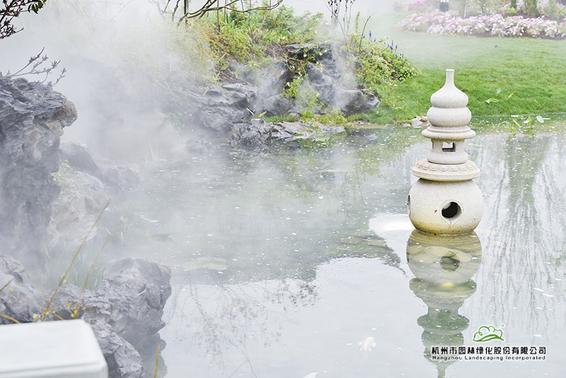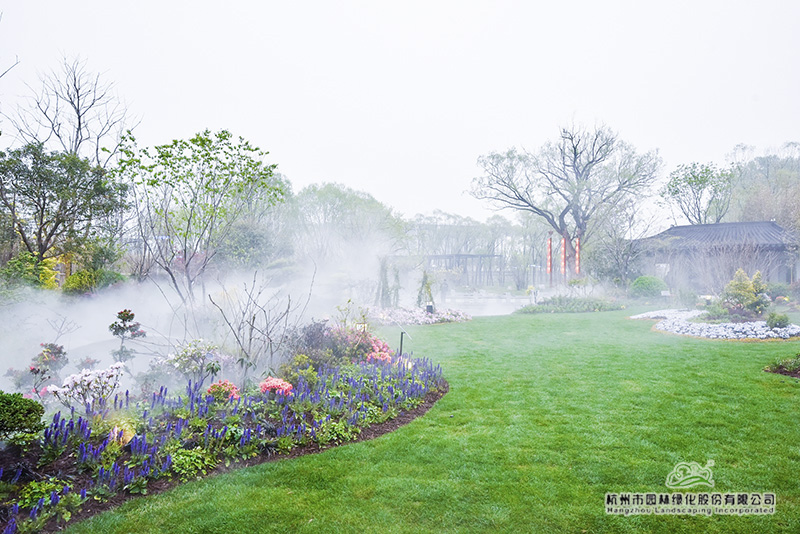 “延慶空氣干燥,而浙江園內的植物,基本來自氣候溫潤的南方,因此,如何有效保水和增加空氣濕度,以此來提高植物的成活率和保證后期生長,是我們施工時必須要考慮的問題。”吳小成說,“所以,園內我們一共做了四套系統(tǒng),大樹根部的滴灌系統(tǒng)和樹上的噴灑系統(tǒng),大草坪的澆灌系統(tǒng),以及針對全園的霧森系統(tǒng)。”