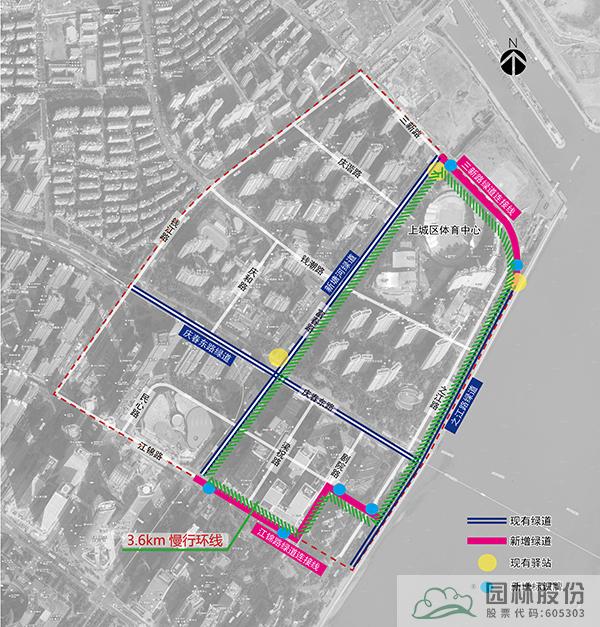 設(shè)計(jì)策略:將紅線范圍內(nèi)現(xiàn)有綠道,通過微改造,整合串聯(lián)現(xiàn)有慢行步道、沿河綠道、沿江綠道,形成3.6km的慢行環(huán)線,并納入杭州綠道地圖中。豐富人群出行方式和體驗(yàn),提升多路徑可達(dá)性。